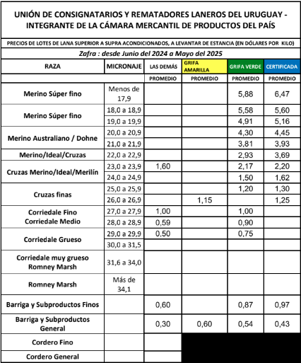 La Unión de Consignatarios y Rematadores de Lana del Uruguay, miembro de la Cámara Mercantil de Productos del País, presentó el resumen anual de precios promedios correspondientes a la zafra 2024/2025. El informe, elaborado a partir de los negocios concretados entre el 1° de junio de 2024 y el 31 de mayo de 2025, refleja un mercado lanero activo, con buena demanda y altos porcentajes de colocaciones.